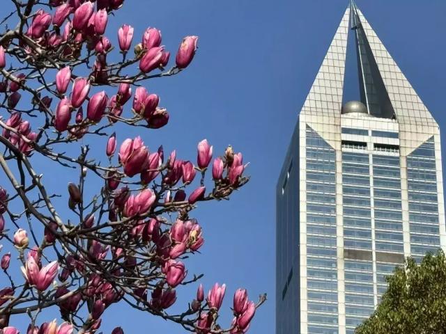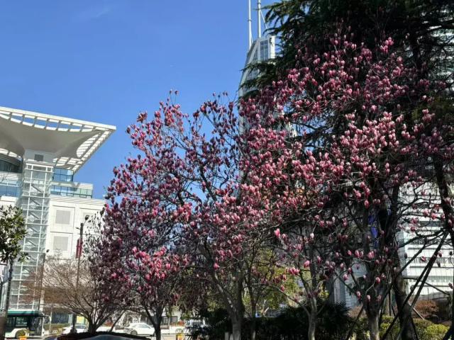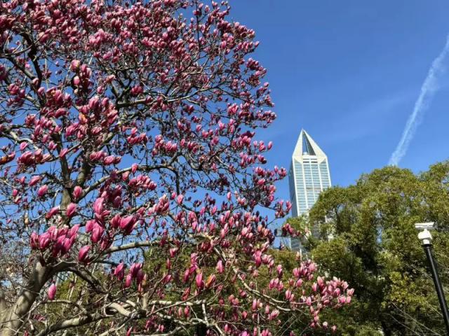 人民广场紫玉兰花娇艳绽放,“闹市花境”绘古今交融!