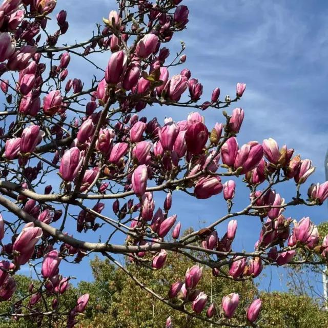 紫玉兰,这个名字可能不常见,但它实际上是木兰科木兰的一员,也被称为木兰或辛夷。在人民广场,紫玉兰以其低矮的株型与白玉兰形成了色彩对比,结合周边现代建筑(如世茂广场、来福士)的霓虹灯光影,营造出“闹市花境”的独特氛围。