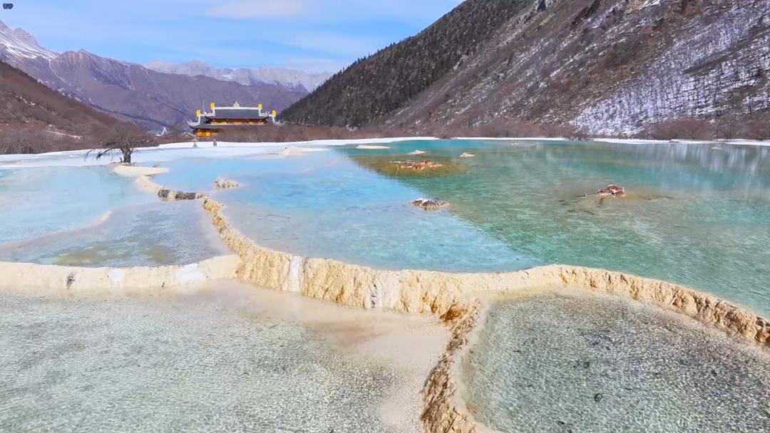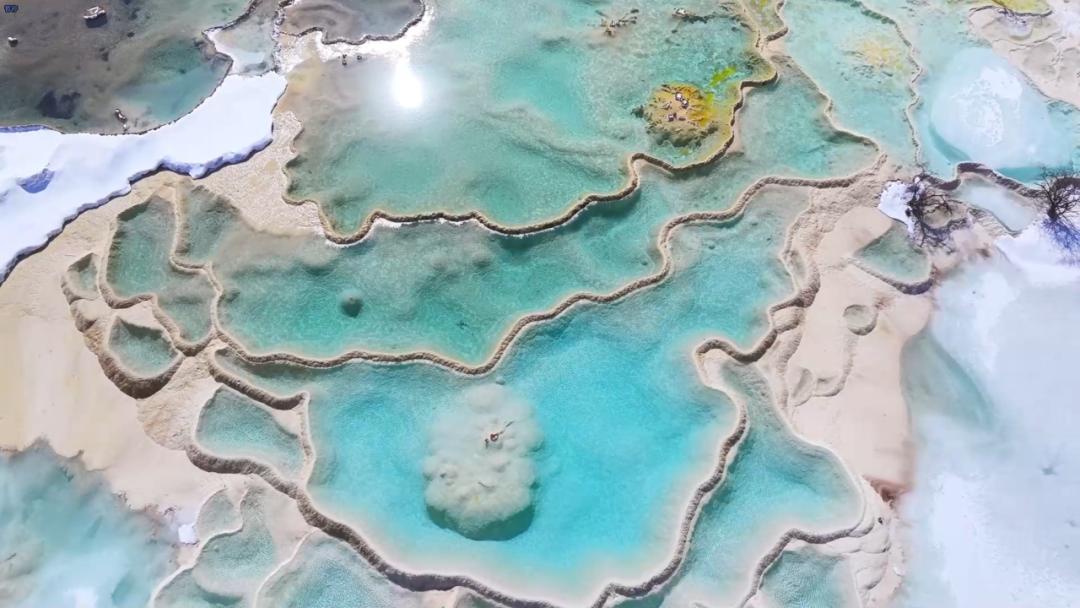 阳光像碎金一样落下,透过薄雾,反射在层叠的钙华池上,水面有一种气场——碧如玉,蓝如海底,黄如琥珀铂,重叠,就像上帝洒下的颜料,在雪山脚下染出一幅流动的画面。