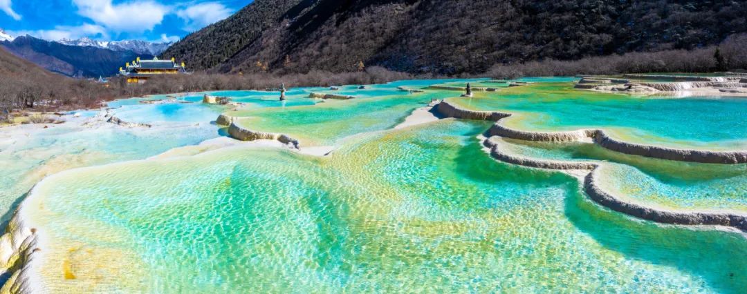 黄龙最令人惊叹的是成千上万的钙华池。彩池静静地躺在雪山的怀抱里,水面清澈透明。阳光倾斜时,池底积累的矿物质反射出梦幻般的颜色,仿佛打翻了梵高的调色板。池塘之间,钙华河堤间隔自然雕刻,水溢出,形成无数微型瀑布,水声叮叮当当,如环佩轻鸣。
