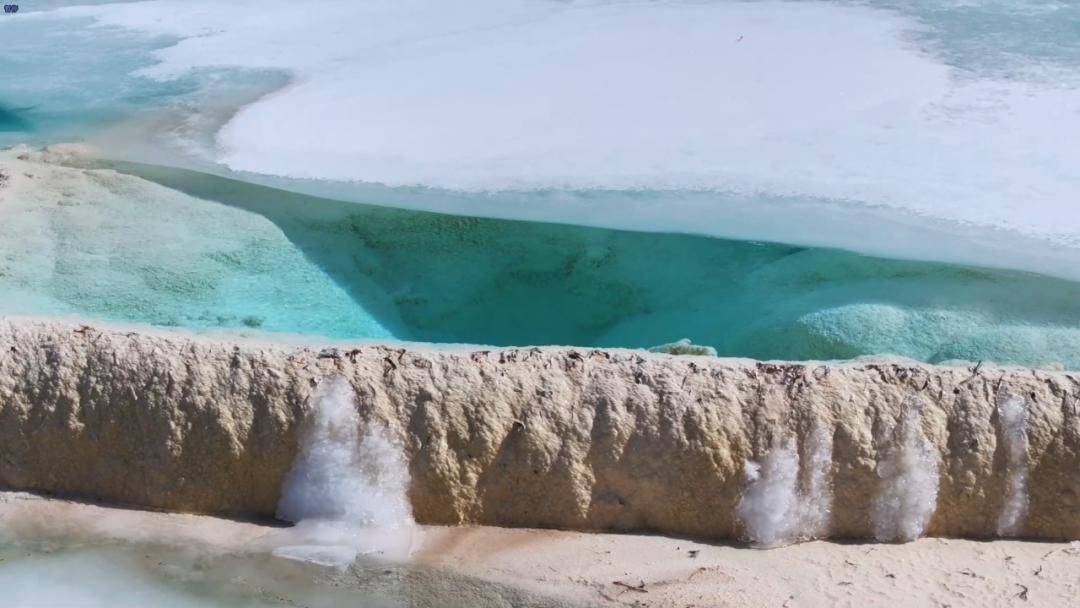 金沙铺地是另一个奇观——金黄色的钙海滩像龙一样蜿蜒,雪水涌向它,在阳光下闪耀着细细的金光,就像一颗流动的星星。