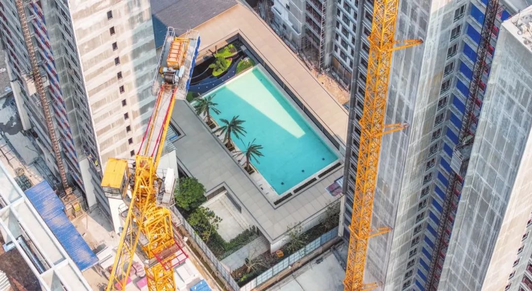 海口横沟村城市更新项目(第一阶段)建设现场,建筑群内嵌有蓝色游泳池,与错落有致的建筑轮廓勾勒出未来城市生活的新景象。记者 康登淋 摄