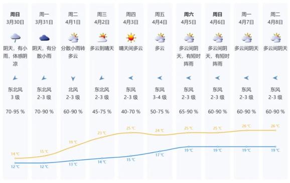 三月三十日,阴天,有小雨,体验阴凉;气温12-14℃;东北风3级,沿海、高地、海区阵风6-7级;相对湿度为70%-95%。