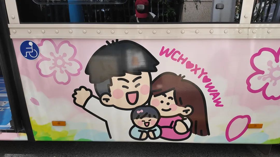 这辆24路电车以樱花粉为基调,车身上布满了鲜花和跳动的爱情图案。