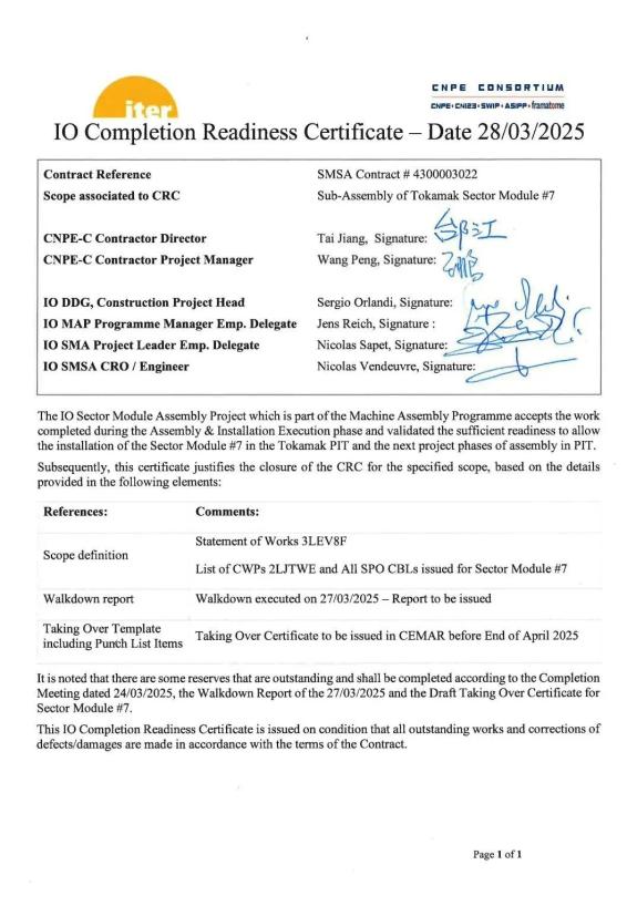 7号(SM7)IO签署真空室模块预组装竣工证书