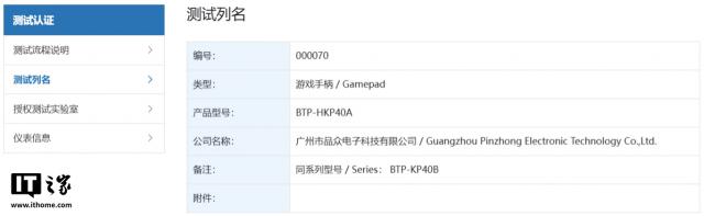 IT 世家 3 月 30 每日消息,型号为"BTP-HKP40A"游戏手柄已经通过了星闪认证(同系列型号:BTP-KP40B),测试认证数据显示,商品来自广州品众电子科技有限公司(北通游戏手柄是该公司的品牌)。