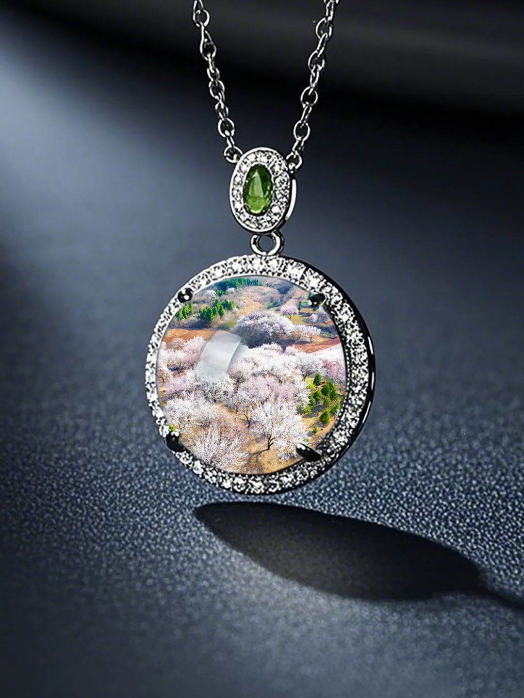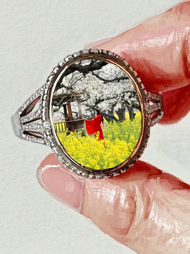 四月中旬,村梨花和油菜花相互呼应,人物就像一部古老的电影。这是一款内藏八荒的琥珀铂,适合搭配汉服和古装。(拍摄 岳建文)