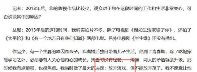在 2013 多年以后,丛珊为儿子已经很少拍戏了,之后更是决定放弃自己的工作。