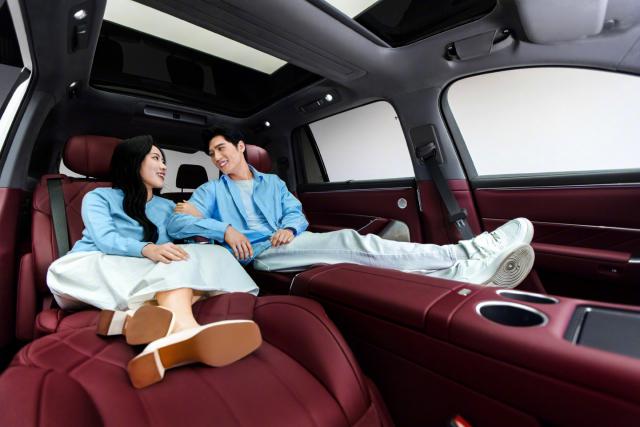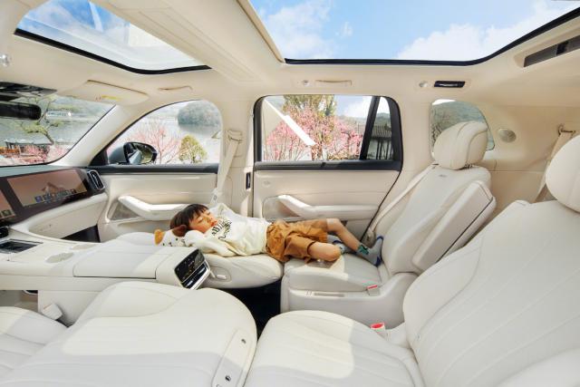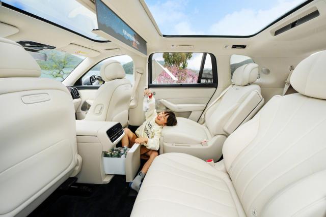 从图中可以看出,问界 M8 前排座椅和第二排座椅放下后,可以形成一个平坦的空间。车顶天窗分为两部分,智能激光投影系统配置,可以组合麦克风 K 歌曲,还有冰箱系统。另外,二排座椅还配备了大量的按钮,方便用户控制。