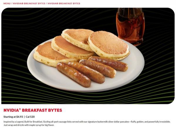 近日,NVIDIA 与丹尼餐厅(Denny's)合作推出了一款限时早餐菜品—— Nvidia Breakfast Bytes,以此向 NVIDIA CEO 向黄仁勋致敬,让顾客有机会感受到同样的“天才早餐”。