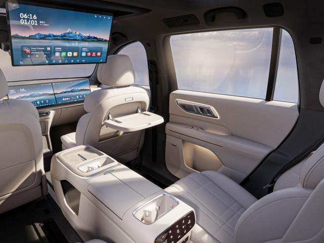 行业内唯一的中排配置“双零重力按摩座椅” 21.4 超清晰的英尺娱乐屏幕。中排座椅支持 180mm 双横滑,一体式云感腿托,8 点式突点按摩,通风,加热。另外,这辆车还配备了 21.4 英尺、3K、16:9 比例、0-75° 后排电动可调娱乐屏幕。该车配备了一体式智能移动中岛,翻盖冰箱 -6 至 50 ℃随心调。