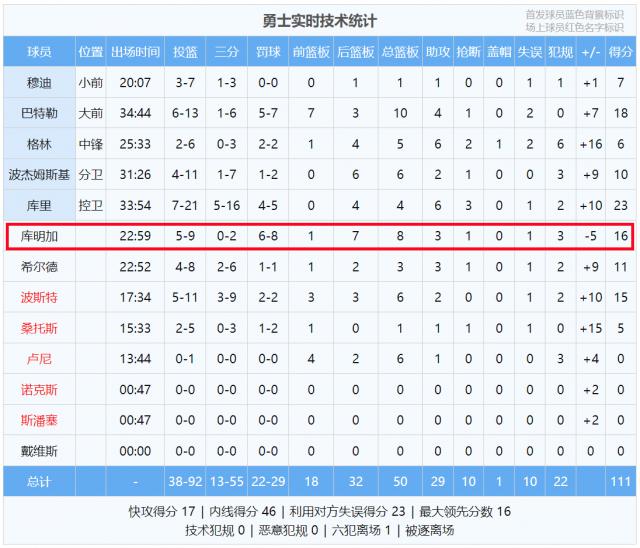 昨日勇士 111 比 95 库明加战胜了鹈鹕 9 投 5 中,罚球 8 中 6,拿到 16 分 7 篮板 3 助攻 1 断球,正负值 -五!这不仅是勇士队的最低正负值,也是全队唯一的负值。一场净胜 16 比赛中,库明加在场时,勇士队净负鹈鹕。 5 分数,每个人都不难想象他打得怎么样。
