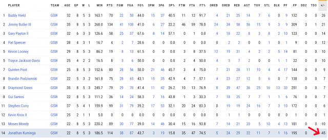 库明加复出打球 8 场比赛,总正负值 -勇士内垫底45。穆迪(-10)倒数第二,凯文倒数第三。 - 诺克斯( 1)。库明加可以说是断档式的倒数第一。希尔德总正负值 勇士队排名第二,巴特勒总正负值; 第二,队伍第二。