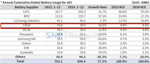 2024 全球动力电池出货排名,信息来源:SNEResearch
