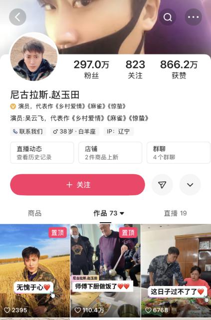 目前吴云飞带货账户有约约。 300 万粉丝,置顶作品包括赵本山在做饭的视频。