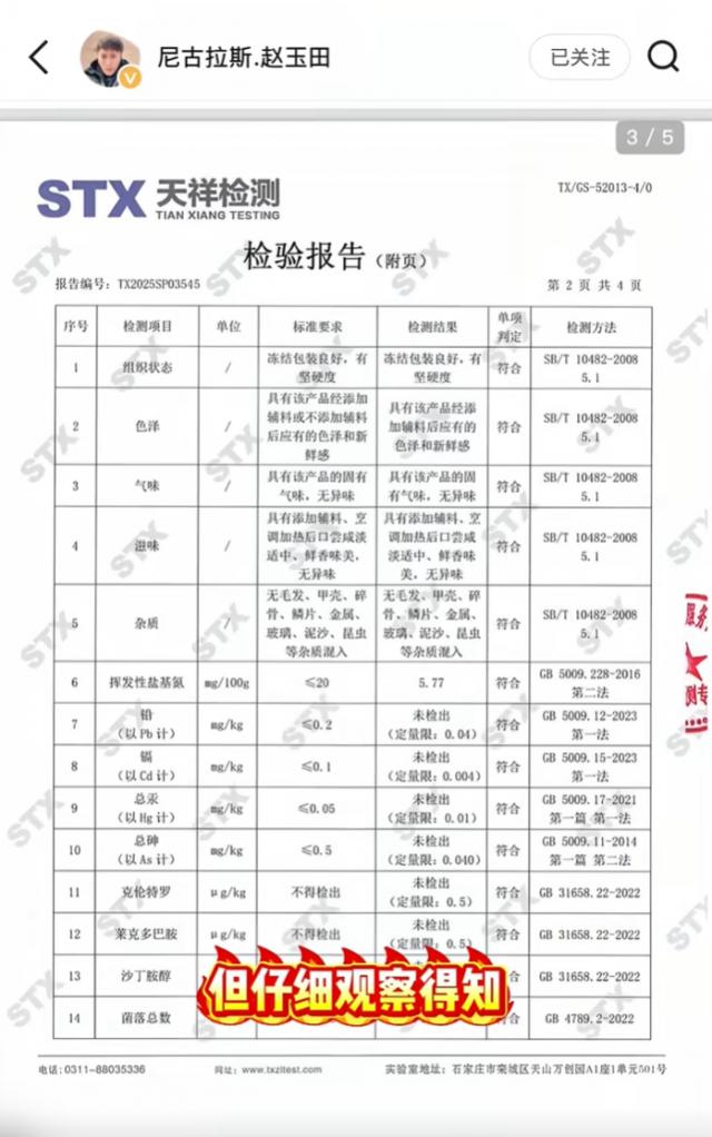 3 月 6 日,“赵玉田”在社交账户上发布了一份合格的产品检验报告。然而,沈先生说,他报告了非法添加保水剂的产品,这份检验报告检测了菌落总数。
