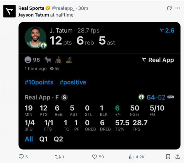 前半场塔图姆 19 分钟,10 中 5,三分 4 中 1,拿到 12 分 6 篮板 5 助攻 1 盖帽子,看起来他的左脚踝的确没有什么严重的问题,塔图姆帮助球队领先马刺。