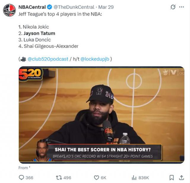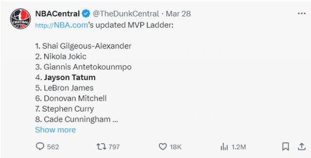 最新一期的 MVP 塔图姆在榜单中排名第四,仅次于第四。 SGA、很明显,塔图姆是联盟的顶级明星,约基奇,扬尼斯。