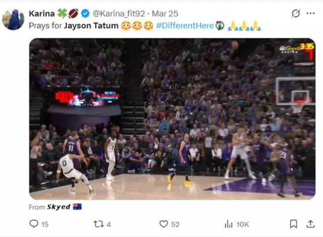 杰森 - 塔图姆在 3 月 25 日本因为小萨博尼斯的垫脚犯规被左脚踝扭伤,然后塔图姆错过了对阵太阳的比赛。然而,塔图姆缺席的比赛绿凯也疯狂地击败了太阳。失去獭兔对绿凯影响不大。