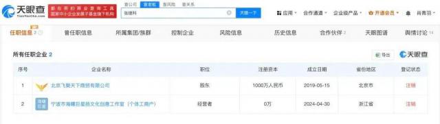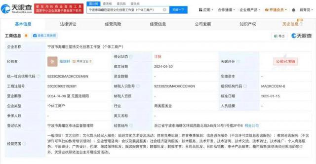 天眼查 App 显示,目前张继科名下有关联。 2 家族企业,均处于注销状态。在这些企业中,宁波市海曙巨星扬文化创意工作室(个体户)成立于 2024 年 4 月份,经营者为张继科,经营范围包括文化娱乐经纪人服务、体育比赛组织、教育咨询服务等。