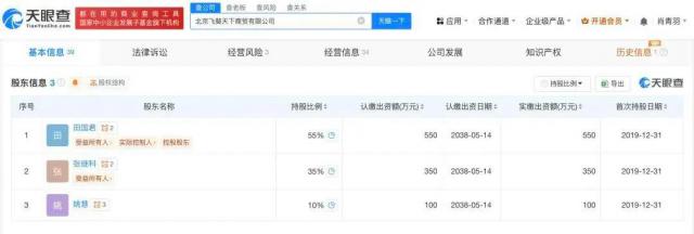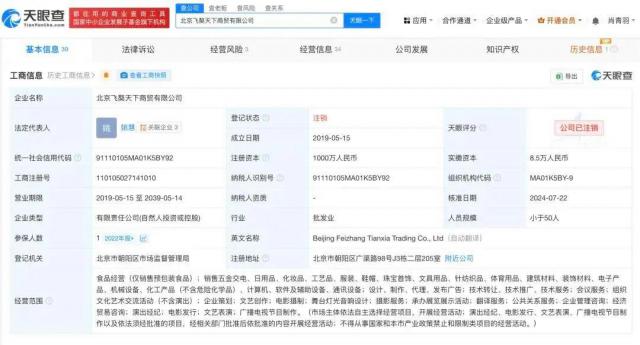 成立于北京飞獒天下贸易有限公司 2019 年 5 月亮,法定代表人是姚慧,注册资本 1000 经营范围为1万人民币,包括食品经营、组织文化艺术交流活动、品牌策划、文艺创作、电影制作、表演经纪人、电影发行、文化表演等。股东信息显示,该公司由田国君、张继科和姚慧负责 55%、35%、10%。