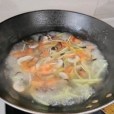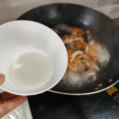 6、将淀粉和清水混合成水淀粉,放入锅中煮汤粘稠。