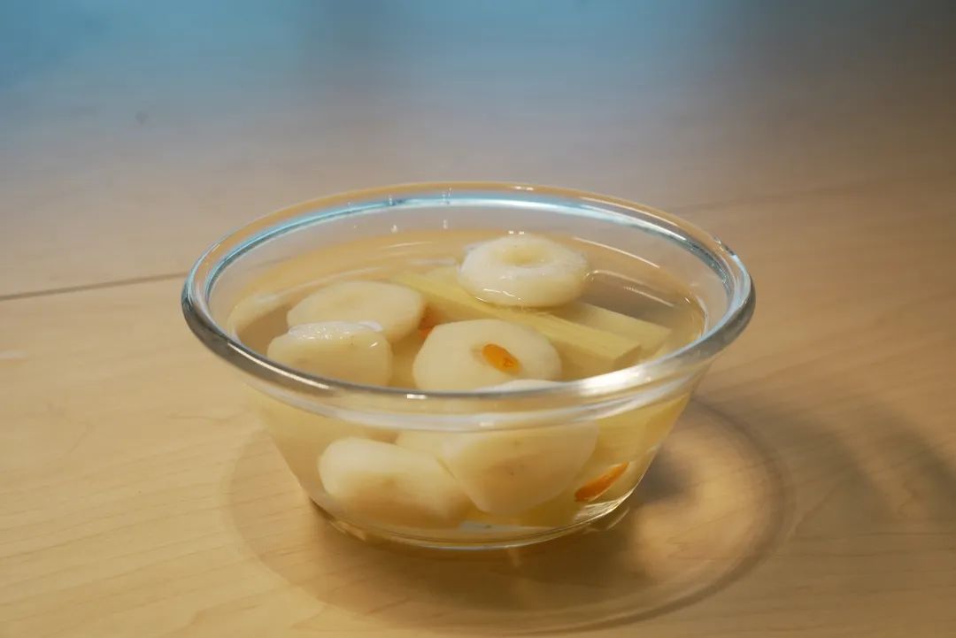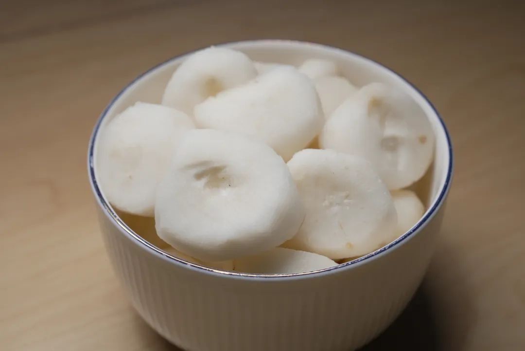 菱角还有一种吃法,就是做糖渍菱角,在江阴也很受欢迎,特别受孩子们的欢迎。先将菱角洗净去皮,放入锅中,加入适量清水,水需要不要通过菱角。然后大火烧开水,用小火慢慢煮10分钟。当木筷子可以轻松插入菱角时,说明菱角煮得恰到好处。这时,取出沥干水分,冷却备用。