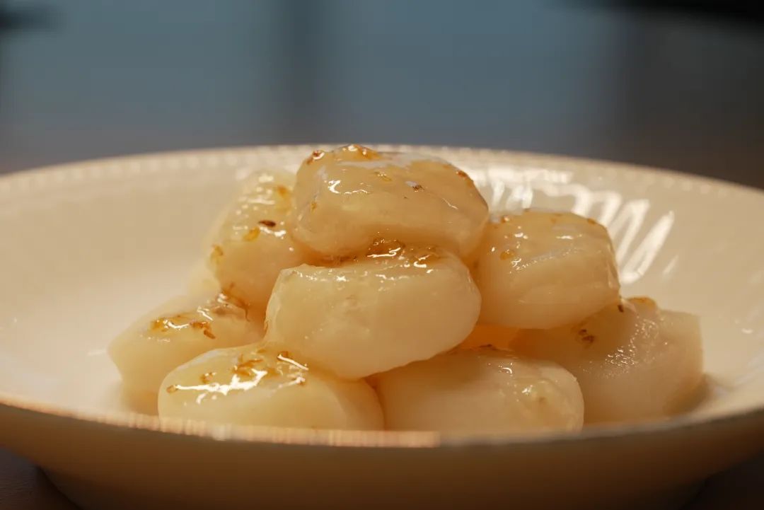 等到菱角凉了,就可以随意摆成自己喜欢的形状,然后淋上一勺粘稠香浓的桂花酱。白色圆润的菱角,配上金黄艳丽的桂花酱,色彩相辅相成,赏心悦目。咬一口,先是桂花酱的甜味在舌尖散开,接着是菱角果实的甜脆在牙齿间爆发,汁液溢出,甜而不腻。不管是饭后甜点,还是闲暇时解馋的小吃,都让人回味无穷。自然,也有人喜欢简单的做法,直接从煮熟的菱角上撒上一把白糖,也是别有一番风味。