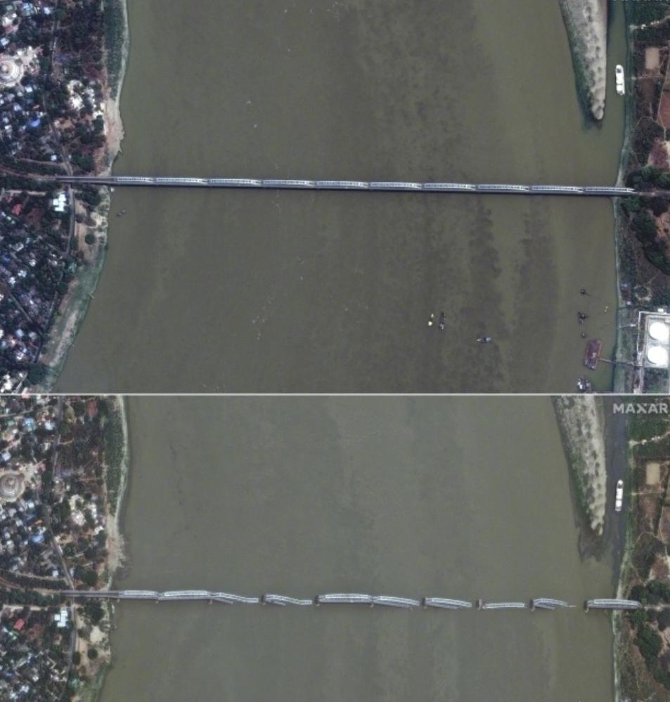 从卫星地图来看,缅甸强震破坏力 一组卫星图片显示了强震前后缅甸曼德勒的对比。从图中可以看出,地震造成了严重的破坏,大量的建筑倒塌,桥梁断成了几段。(@中国新闻网)