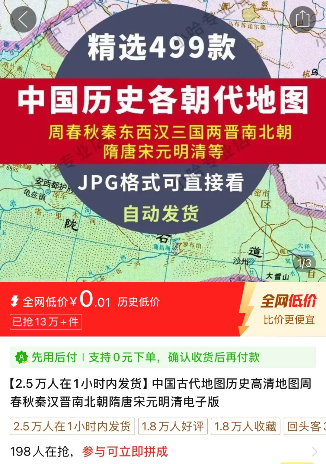 另外一家商店的“ 中国历史各朝代地图优选499款 ",价格也是 1分钱。