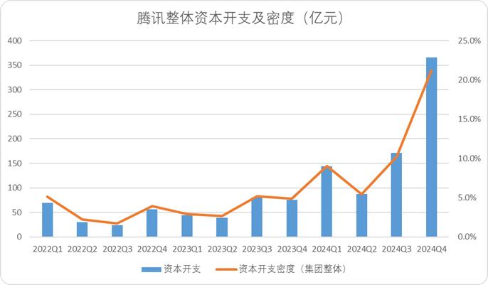 然而,回过神来的腾讯加大了投资力度。正如刘炽平业绩会所说,腾讯第四季度的整体资本支出绝对可以算是中国互联网的领头羊,从资本支出密度来看,Q4腾讯的资本支出密度在2024年达到惊人的21.2%