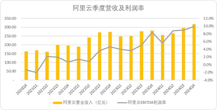 与此同时,在利润方面,阿里云的EBITDA利润率直到2023年才在低位数盈亏平衡线上挣扎,但2024年增长明显,Q4更接近两位数的区间。