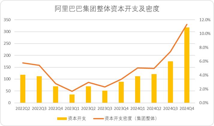 同样,阿里巴巴也是本轮资本支出周期的旗手,自2023Q3低点以来,资本支出连续六个季度环比增长,资本支出密度大幅增加。。按第四季度计算,阿里资本支出已占季度收入的11.3%左右,属于较高水平。