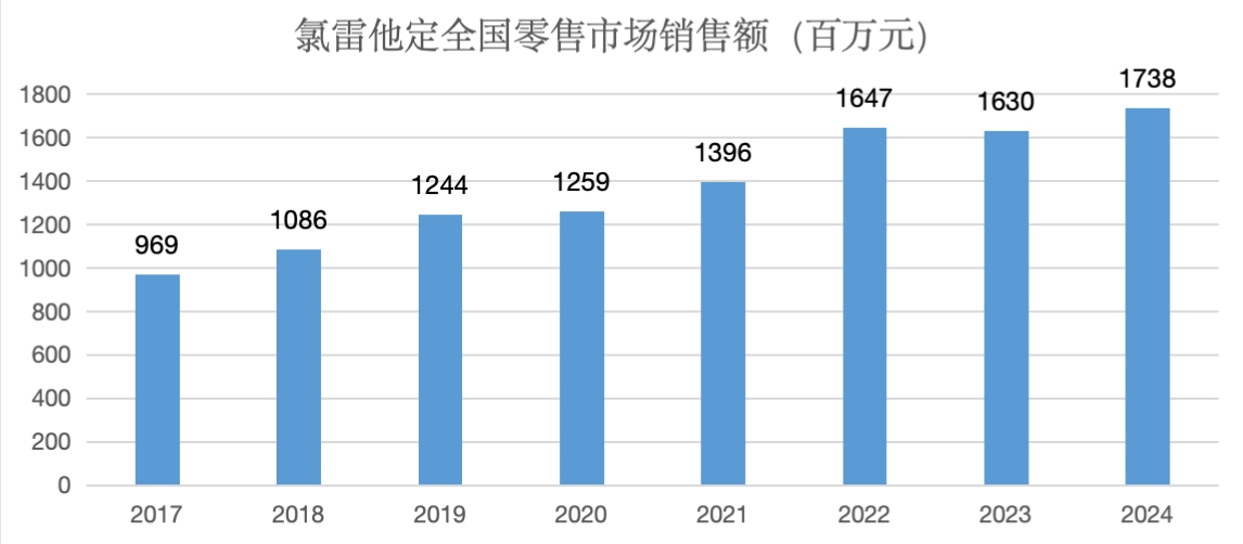 因此,氯雷他定进入集中采购后的销售额仍在持续上升。根据中康控股旗下中康科技开思系统的数据,近五年来,氯雷他定在全国零售市场的总销售额已经超过76亿元;直到2022年,这类产品的年销售额仍能保持在10%以上。