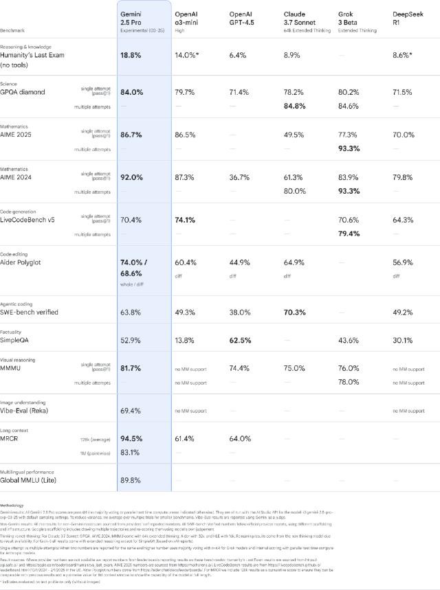 Gemini 这儿,就是三月 25 日推出的 2.5 Pro Experimental,推理、代码敲击和多模态理解都得到了全面提高。数学和科学基准测试(例如 GPQA 和 AIME 在2025年中排名超过排名 OpenAI 的 03 mini。