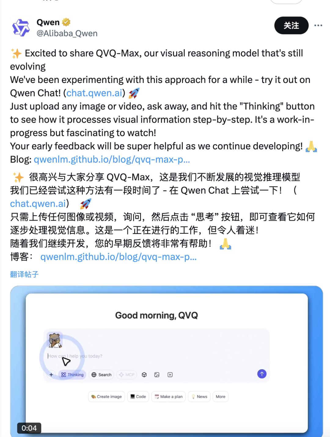 Qwen 全新版本的视觉推理模型于周五凌晨发布。 QvQ-Max。不仅能够「看懂」图片和视频中的内容,也可以结合这些信息进行分析、推理,甚至给出解决方案。