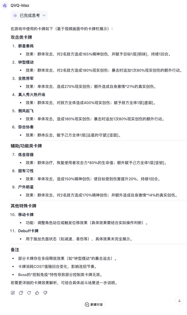 两边总结出不同的想法,Qwen 按技能类型划分,主要参考卡面的文字展示。