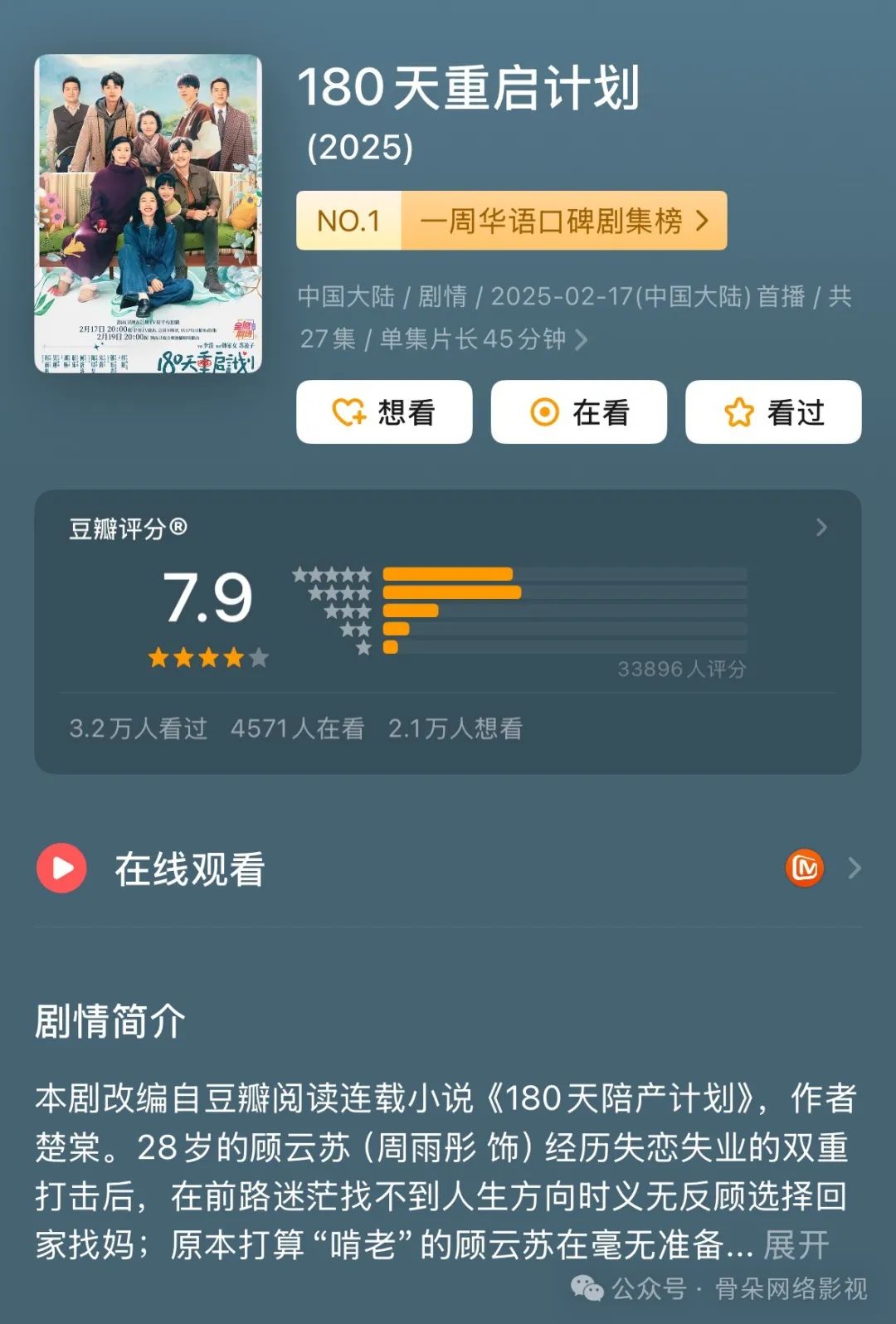 而且这些豆瓣分数高但观众少的剧集,都有两个共同的特点,第一,这类剧集讨论的话题比较少,大众不在乎。。比如《180天重启计划》中“一边斗嘴一边互相帮助”的母女,虽然每天都很漂亮,但是女儿陪50岁的妈妈生二胎真的不能让大众感同身受;第二,这部剧的种类比较少,目标群体是固定圈子里的少数人。这些人往往是审美好的年轻人,与豆瓣用户的画像高度重叠。。