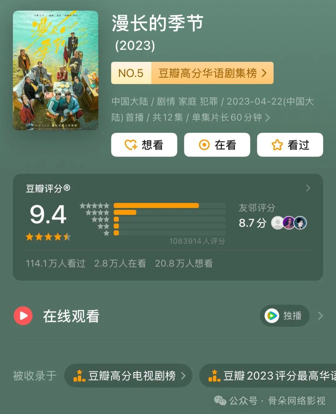在这一背景下,豆瓣高分的第一层含义是全民向影视剧传播,口碑好,可以破圈传播。。这类作品不仅客户得分高,而且有很多人观看,在社交媒体上也有很高的讨论度。它是一部兼具社会影响力和文化价值的优质作品。比如51.3万人看过《花》,得了8.7分;114.1万人看过《漫长的季节》,得了9.4分;142.4万人看过《哪吒》,得了8.5分。