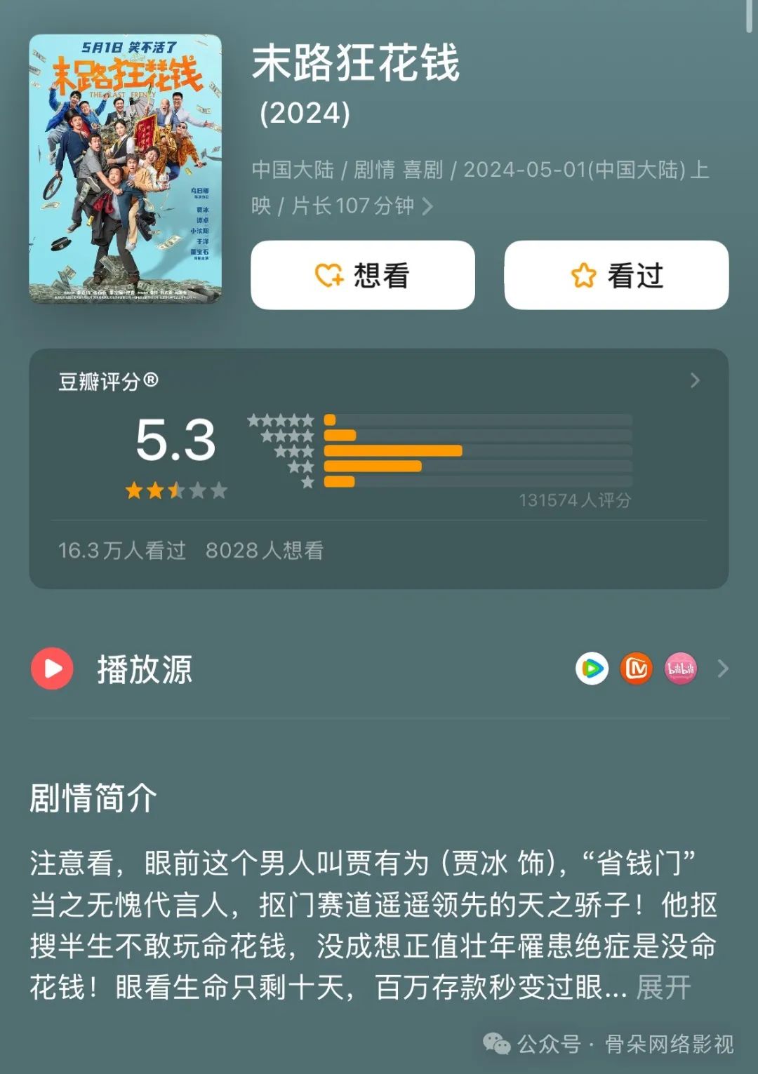 还有电影《末路狂花钱》,豆瓣评分只有5.3,但票房达到7.81亿元。在豆瓣用户眼里,这是一部“阳刚之气”太重的无脑喜剧。然而,在电影从业者眼里,这部小成本电影在去年的冷清市场上跑出了黑马票房。显然,它抓住了疫情后人们对金钱的焦虑,引起了公众的共鸣。这是一个小而大的好项目。