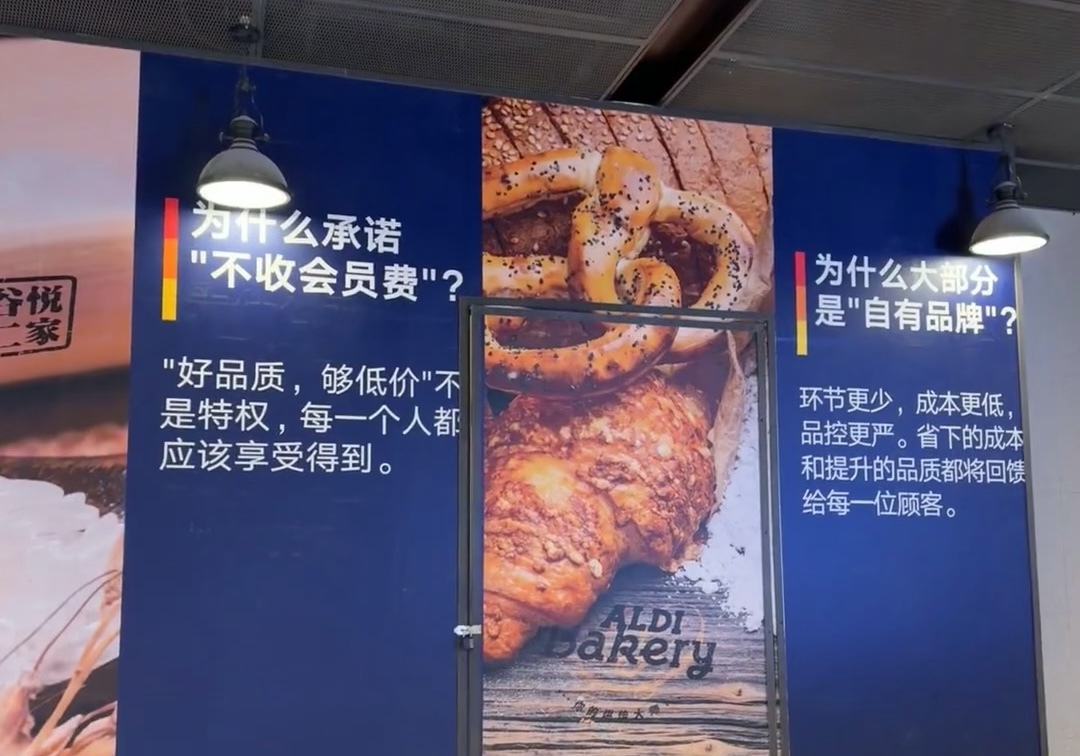 奥乐齐将自己的特点以大字报和提问的形式呈现在无锡圆融这家新店的围栏上——“什么是奥乐齐足够低价”、为什么承诺不收取会费?、"为什么大部分都是自主品牌?"-这些标签有些类似于山姆,有些则指向山姆的背面。