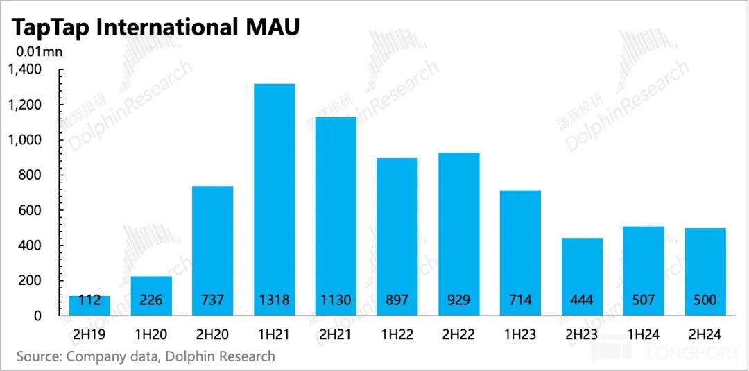 下半年 TapTap 国内月活(计算)为 4485 万,同比增长 环比增长的19% 161 万。主要是《心跳小镇》带动的。此外,公司还提到了营销推广的因素。海豚君认为,暑假期间可能会有各种各样的游戏和战斗 TapTap 提高用户粘性。