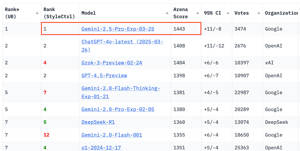 作为 Google 首个「全方位智能体底座」模型,Gemini 2.5 Pro 就对话能力而言,可以算是技压群雄,大模型试炼场机制相对合理。 Chatbot Arena 坐在第一位,并且大大领先于其它一批顶级大型模型,包括 Grok-3、GPT-4.5、DeepSeek-R1。