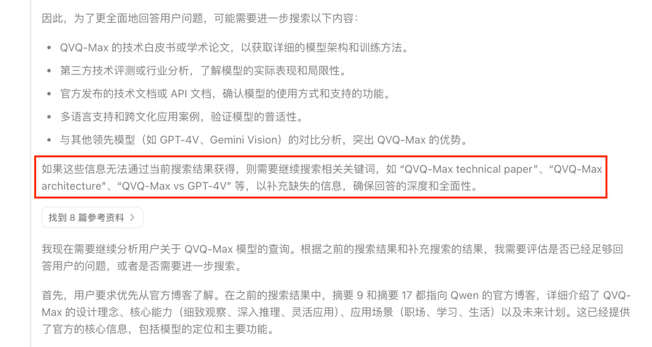 例如,我试着让豆包了解更多。 QVQ-Max 模型,它进行了两次搜索:第一次找到 16 本文参考资料,考虑到部分资料的不足,再次进行了第二次搜索,找到了。 8 文章参考资料。