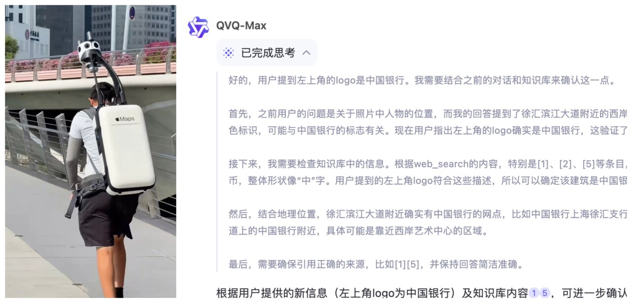 另外值得一提,QVQ-Max 现在已上线了 Qwen Chat(https://chat.qwen.ai),简单上手感受一下,对照片的分析明显强于Qwen2.5-Max,甚至可以根据「左上方的logo是中国银行。」提示对应于照片中。