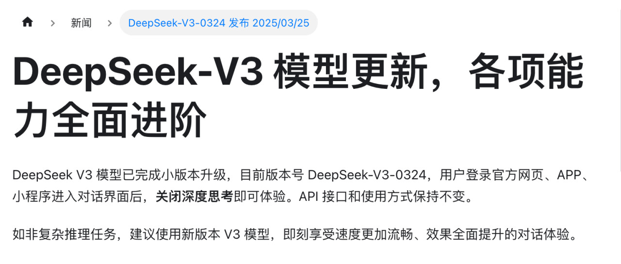 DeepSeek-V3 最新发布的 0324 小版本更新,依然延续。「小体积 大能力」的路线,主要参考了 DeepSeek-R1 强化学习技术在模型训练中的应用,进一步优化了推理、写作、编程能力。