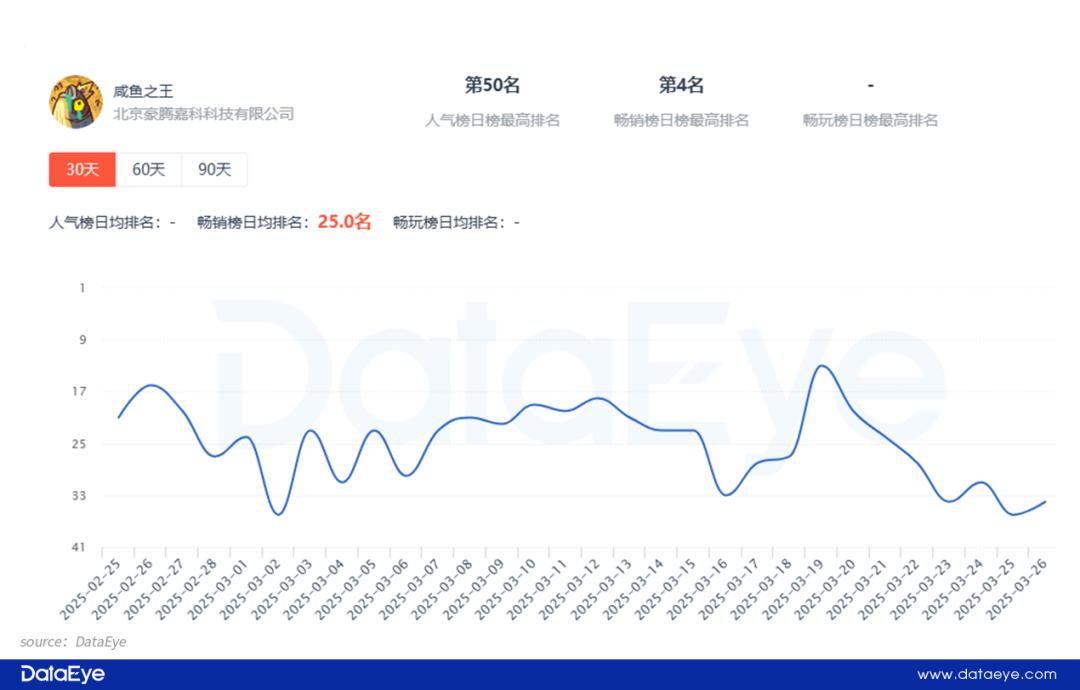 因为这种情况也出现在以前的小游戏王产品《咸鱼之王》中。即使《咸鱼之王》很难回到巅峰,它也可以一直活跃在畅销榜上。数据显示,《咸鱼之王》近30天仍保持在畅销榜前40名,最高排名在过去90天一度达到第4名。