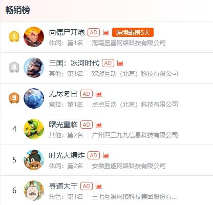 具体来说,《无尽的冬天》和《三国:冰河时代》是常见的SLG产品,《三国:冰河时代》曾经在3月份的微信游戏热销榜上排名第一,目前基本稳定在TOP3。