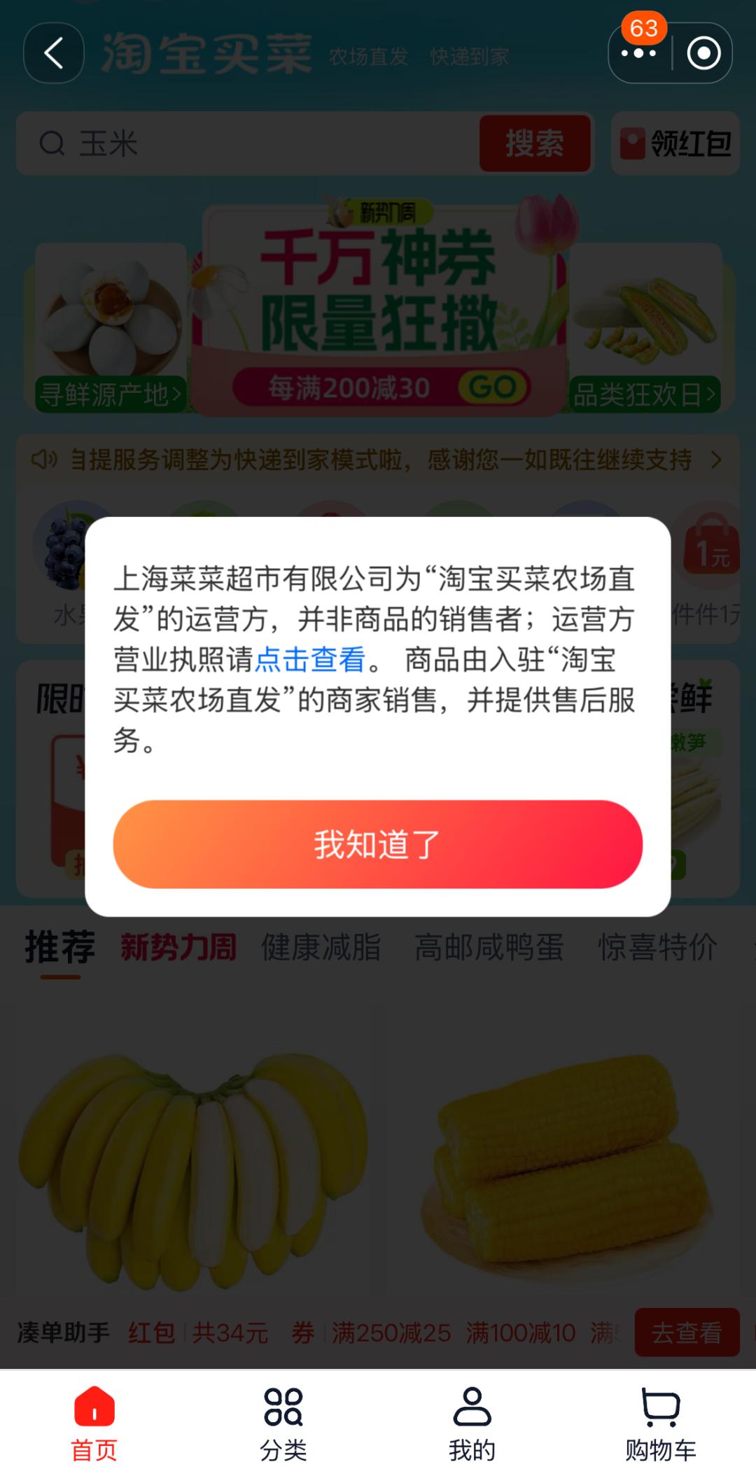目前淘宝杂货购物首页显示,上海、广东、河南、安徽、辽宁等部分地区无法提及自己的要点。3月26日,记者再次登录淘宝杂货购物,页面弹出关闭区域的公告。同时,还有“农场直接发货”和“快递回家”的标志。生鲜产品和日用品均可享受淘宝官方“200-30”优惠政策,产品页面标注“24小时”或“48小时”发货。