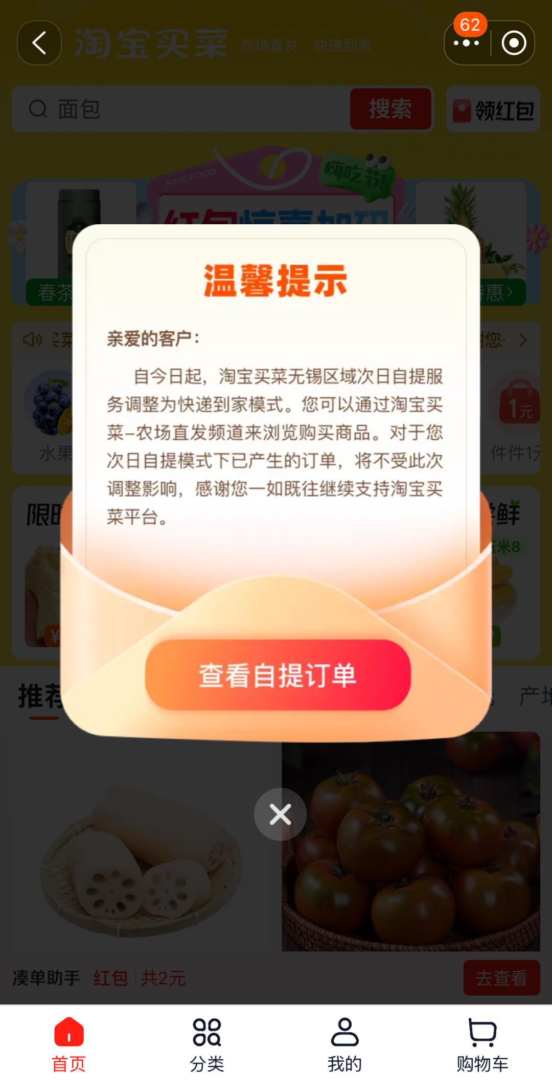 3月26日,《IT时报》记者在淘宝App中打开“淘宝杂货店购物”,页面跳出提醒:“从今天开始,淘宝杂货店购物无锡区第二天提供的服务调整为快递到家,可以通过“淘宝杂货店购物-农场直发”渠道浏览购买商品。”